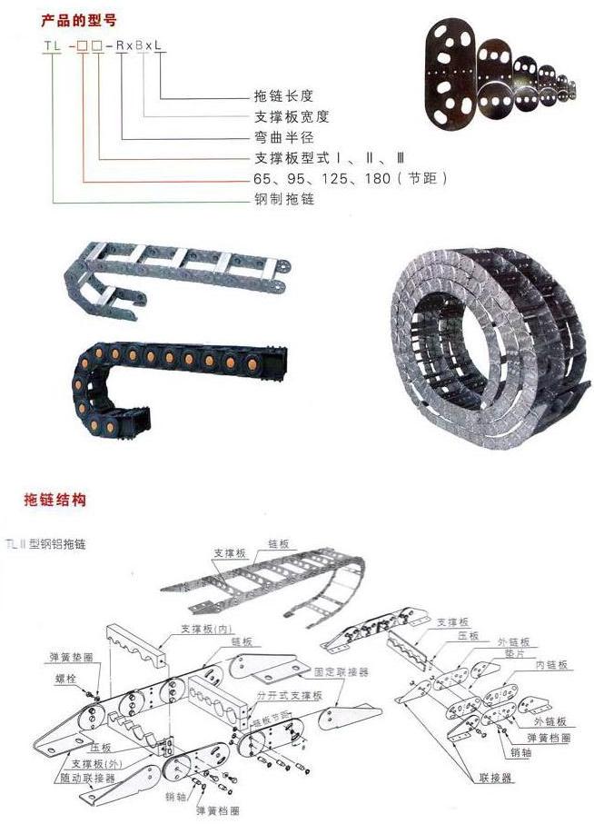 TL系列鋼制電纜拖鏈,銷軸及支撐板和隨動連接器等零件組成。拖鏈可適用最大移動速度為40米/分,拖鏈安全使用壽命不少于100萬次(往復(fù))。該產(chǎn)品具有設(shè)計精巧、使用靈活等特點,被廣泛應(yīng)用與冶金、鋼鐵、鑄造、大型機(jī)械等行業(yè)作為短距離,油、氣、水軟管和電纜同時移動之用。