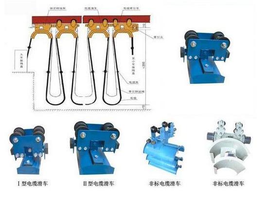 二、電纜滑車系列為起重機(jī)小車供電的一種導(dǎo)電形式,它由行走輪、支架、托板組成,將軟電纜固定在托板上,由牽引架與電纜滑車同步,從而實(shí)現(xiàn)電纜供電目的。