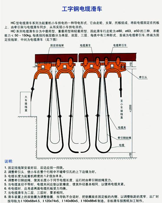 三、ZYGHC型系列工字鋼滑車裝置用于移動(dòng)供電機(jī)械在移動(dòng)中電纜的懸吊與移動(dòng),已廣泛應(yīng)用于各類起重機(jī)械中。該裝置具有結(jié)構(gòu)堅(jiān)固。移動(dòng)靈活。安全可靠等優(yōu)點(diǎn)。